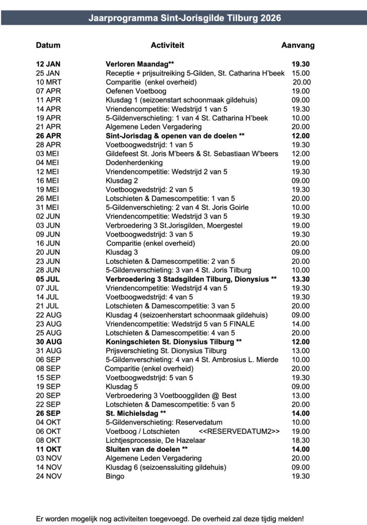 Jaarprogramma Sint-Jorisgilde Tilburg Klik hier om het jaarprogramma voor 2026 in PDF-formaat te downloaden.